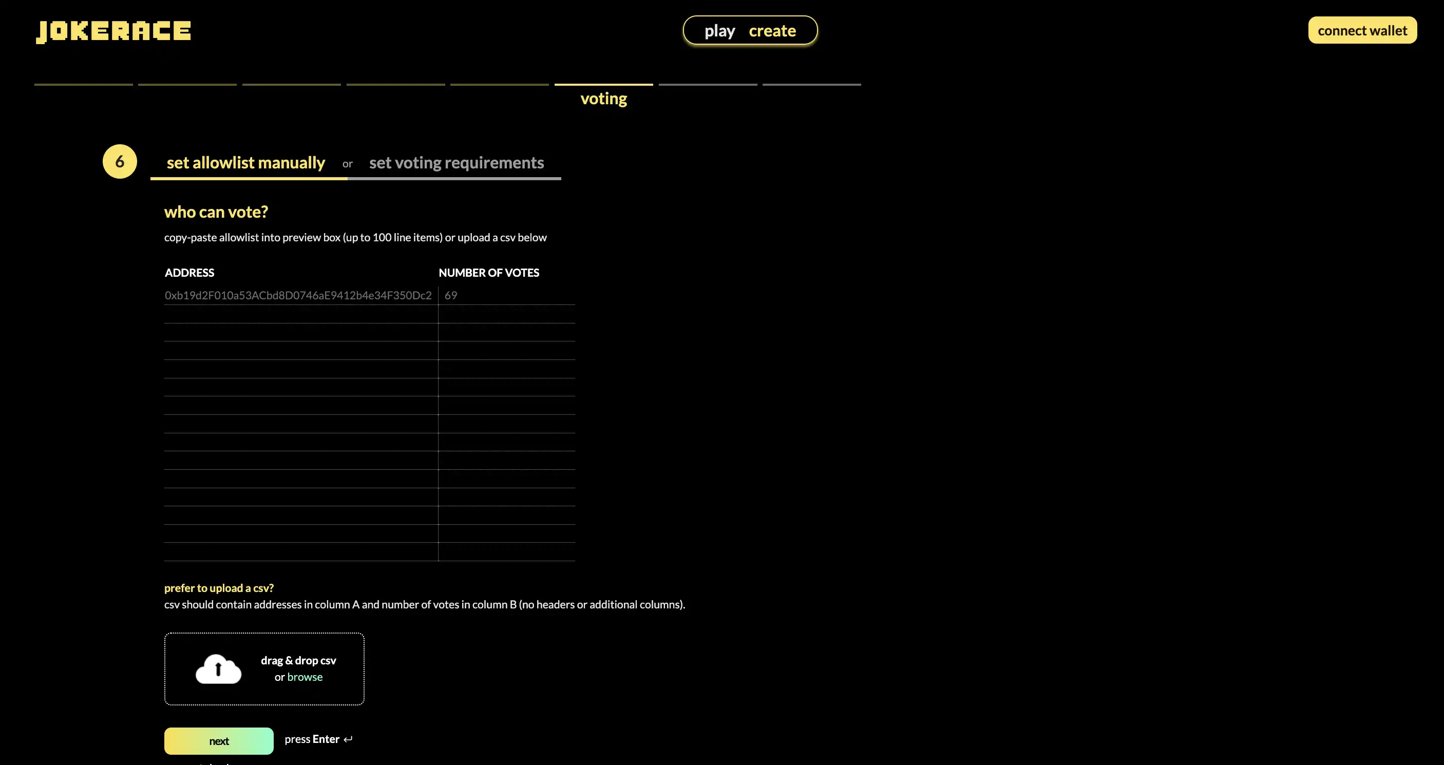 比如你想要为关注你的 Twitter 用户创建一个链上「竞赛」,希望他们为你的创作提供更多建议,只需让他们把地址加入 Guildhall,然后导出到电子表格的 A 列,在 B 列给予他们想要的投票权重,最后在 Jcokerace 网站上传 csv 文件,就完成了「竞赛」的创建。一些人提交了他们认为的创作建议,还有一些人提交了一些内容创作选题。当你认为提案足够多了之后,就可以开启投票,而最终获得更多票数的提案人就会获得你设置的奖励。
