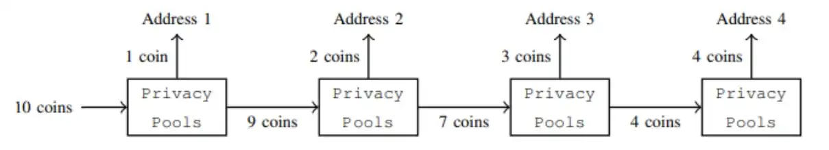一个自然的问题是如何扩展这个设计以支持隐私池。将其原封不动地插入隐私池并不理想,因为交易图与我们直观上期望的不一致:如果一个用户存入 10 个代币,然后在四次连续的取款中花费 1 + 2 + 3 + 4 个代币,我们希望将这四次取款都视为原始的 10 个代币存款的来源。但实际上得到的结果如下图所示:第一次取款的来源是 10 个代币的存款,然后第二次取款的来源是第一次取款创建的 9 个代币的找零输出,依此类推。这在实践中会导致问题,因为它要求 ASP 验证中间存款并将其添加到其关联集合中。