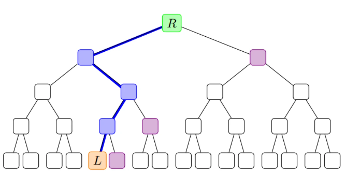 代币 ID 的集合存储在称为 Merkle 树的数据结构中:如果树包含 N 个项目,则每个相邻的项目进行哈希(导致⌈ N/2 ⌉个哈希),每个相邻的这些哈希再进行哈希(导致⌈ N/4 ⌉个哈希),依次类推,直到整个数据被提交到单个根哈希中。