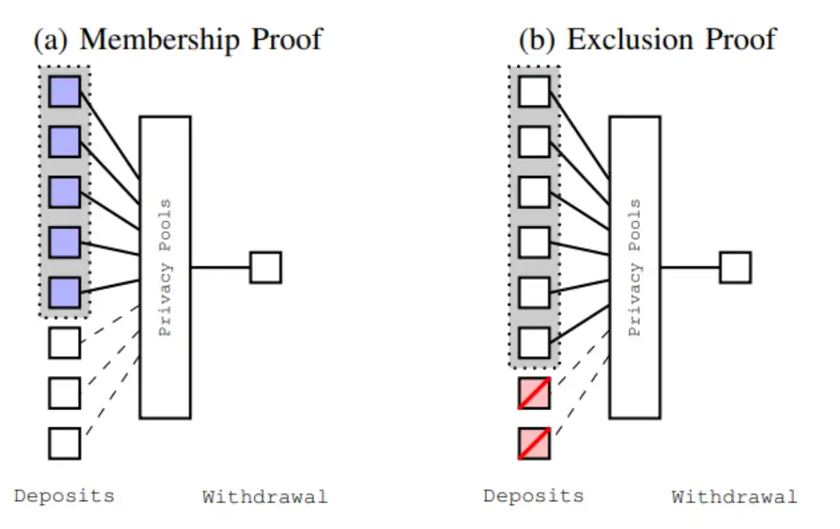 隐私池的核心思想是:用户不仅仅通过零知识证明来证明取款与之前的某个存款相关联,还证明其属于一个更严格的关联集合。关联集合可以是之前所做的全部存款的子集,也可以是只包含用户自己存款的集合,或者介于两者之间的任何集合。用户通过提供关联集合的 Merkle 根作为公共输入来指定该集合。