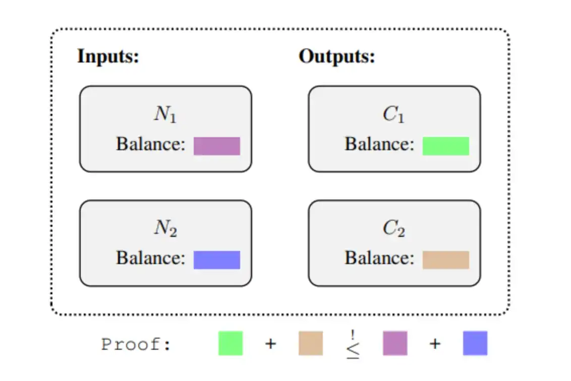 上面简化的隐私保护币系统仅支持相同面额的币转账。Zcash 通过使用 UTXO 模型来支持任意面额。每个交易可以有多个输入(需要发布每个输入的零化器)和多个输出(需要发布每个输出的代币 ID)。创建的每个代币 ID 必须附带一个加密的面额值。除了证明零化器的有效性外,每个交易还必须附带额外的证明,证明被创建的币的面额之和不超过被花费的币的面额之和。下图说明了这个额外的证明。