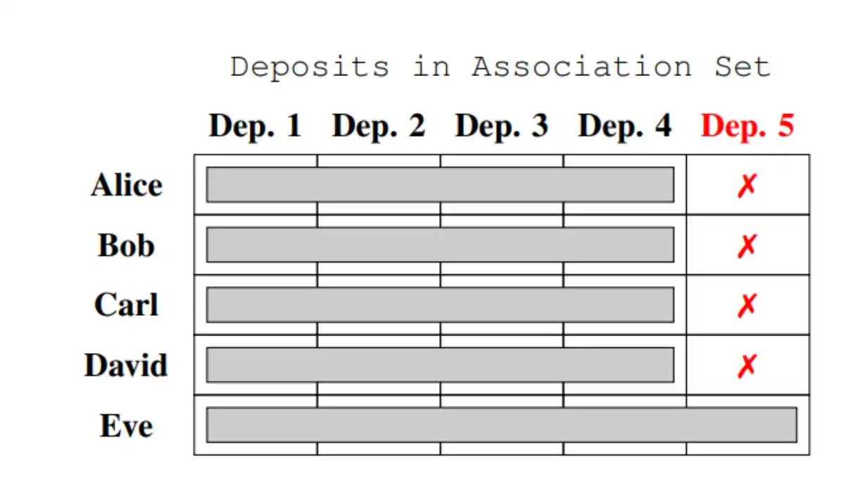 假设我们有五个用户:Alice、Bob、Carl、David、Eve。前四个用户是诚实守法但注重隐私的用户,而 Eve 是一个小偷。因为公众通过标记为「Eve」的地址的硬币是被盗的信息,知晓 Eve 是小偷。在实践中,这种情况经常发生:在公共区块链上,因为 DeFi 协议的漏洞被利用而产生的资金被追踪标记,从而识别流入 Tornado Cash 的非法资金。