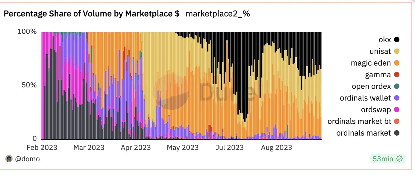 据 Dune 数据显示,自 5 月 23 日 OKX Web3 钱包上线 Oridinals 市场以来,其市场份额占比已从 0.3% 不断扩大。尤其是在 7 月 12 日,OKX Ordinals 市场份额一度触及 83.3%,几乎垄断比特币 Ordinals 生态。截止 9 月 5 日,OKX Ordinals 市场份额已经回落至 34.2%,仅次于 unisat 的 45%,位居 TOP2。