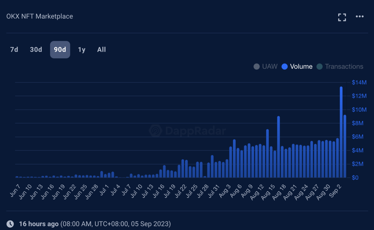 据 DappRadar 数据显示,尽管当前 NFT 领域交易量创下历史新低,但 OKX NFT 市场交易量呈不断上升趋势。9 月 3 日,OKX NFT 市场近 24 小时交易量达到 1340 万,再次创下历史新高。此前据吴说区块链报道,OKX NFT 市场交易量逆势增长原因,或与其零手续费以及 OKX Web3 钱包提供较好的用户体验有关。