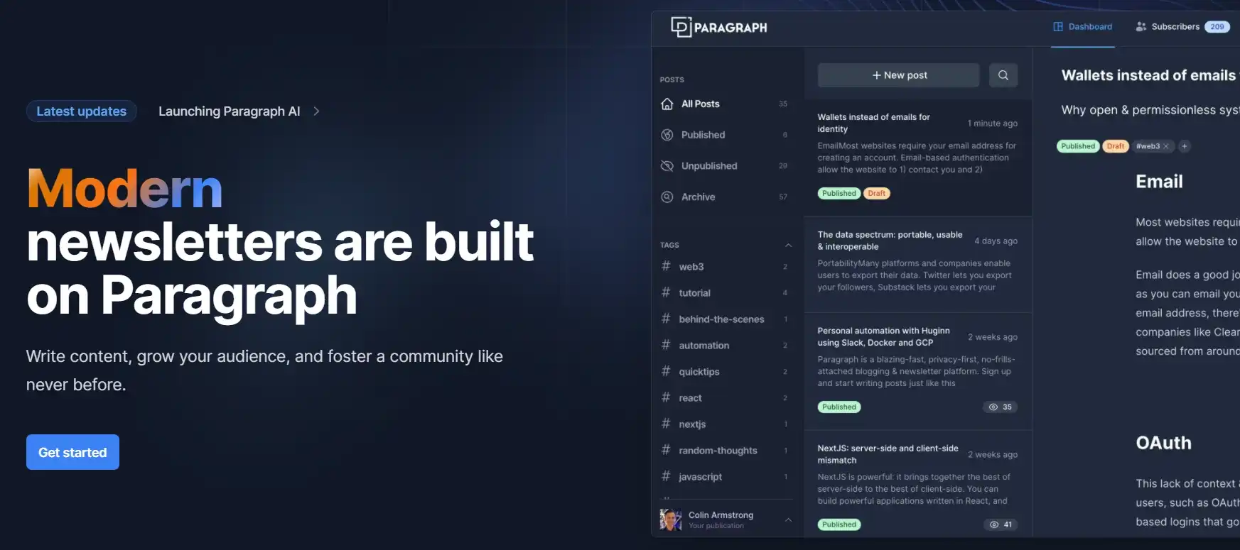 简介:Paragraph 是一个链上创作者平台,可帮助创作者围绕其内容发布、共享和建立业务,发布在 Paragraph 上的文章将永久储存在 Arweave 上,读者可以用他们的钱包地址或电子邮件订阅喜欢的作者,也可以将内容转发到如 Farcaster 这类 Web3 社交平台上进行讨论。