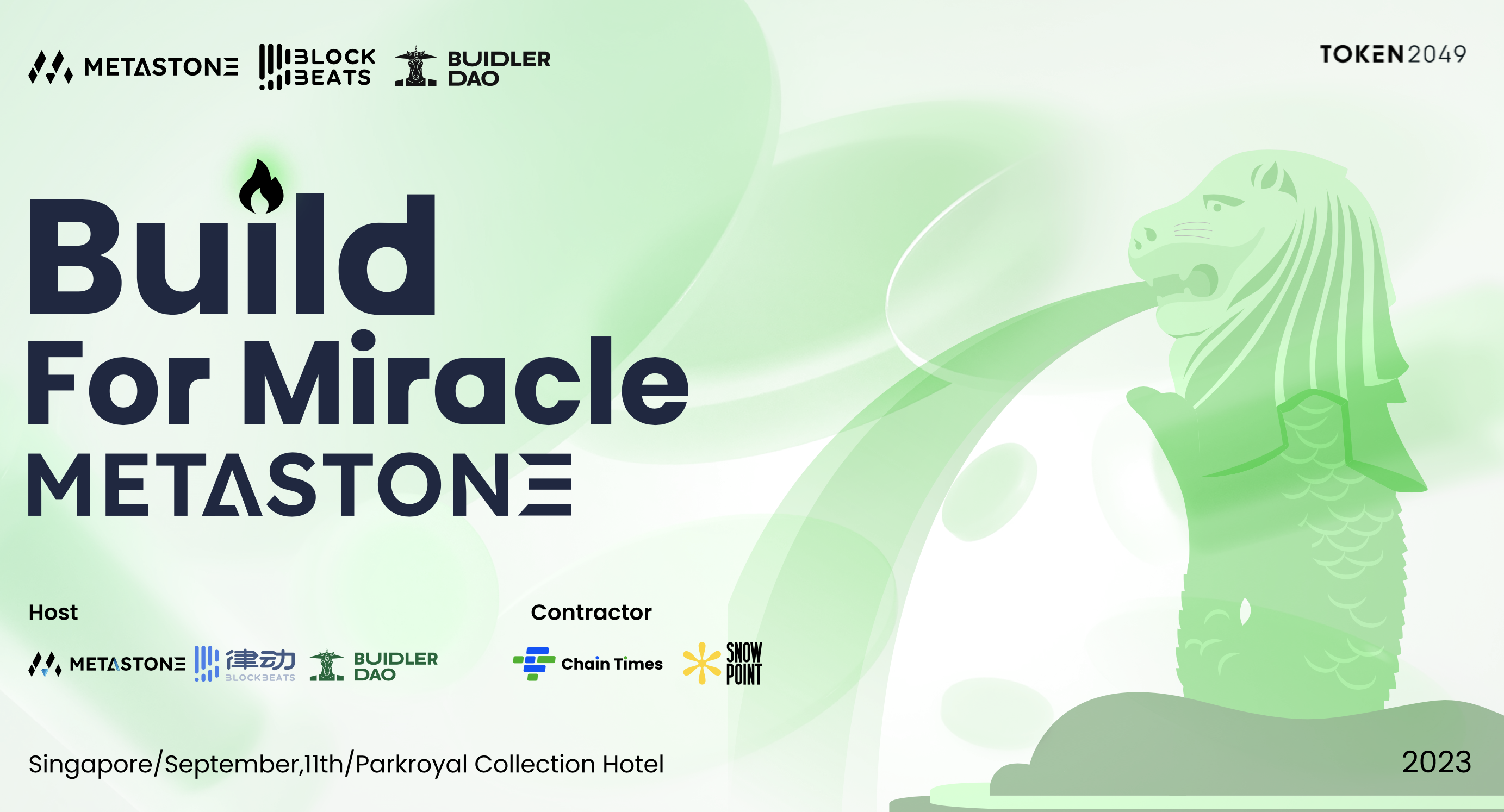 与 MetaStone Group、Cregis、BuidlerDAO 联合举办的「Build For Miracle」系列主题活动将在 TOKEN2049 期间召开。本次活动场地为新加坡顶级五星级酒店 Parkroyal Collection Hotel,预计参会规模将超千人。本次活动旨在通过 Demo Day、行业峰会和私人晚宴等形式,帮助优秀团队和项目发展,探索 Web3 发展趋势、共建行业生态与合作。