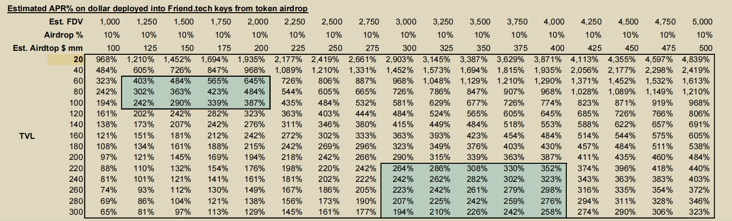 • 如以下表格,若最终 Friend.Tech 发币 FDV 为 1.5Bn,10% 作为空投,平均 25 周内 TVL 为 80mm,而参与者空投比例与参与 TVL 相当,则最终年化空投利率约为~360%。