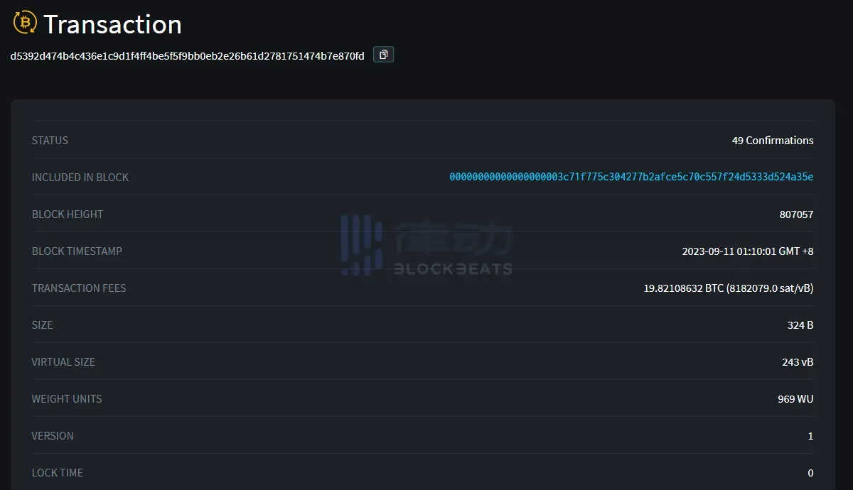 据链上信息显示,北京时间今日 1 时,比特币链上出现单笔费用 19.82 BTC(价值约合 51 万美元)的交易,创历史记录。