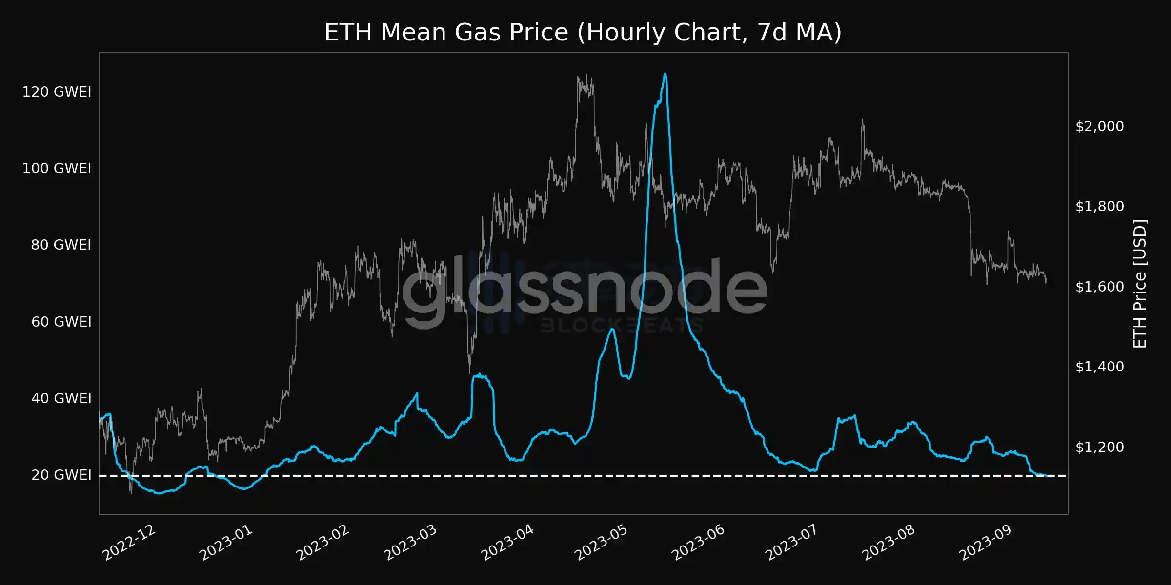 据 Glassnode 数据,以太坊网络平均 gas 价格(7 日移动平均值)为 19.567 GWEI,已回落至今年年初水平,刷新 8 个月以来新低。