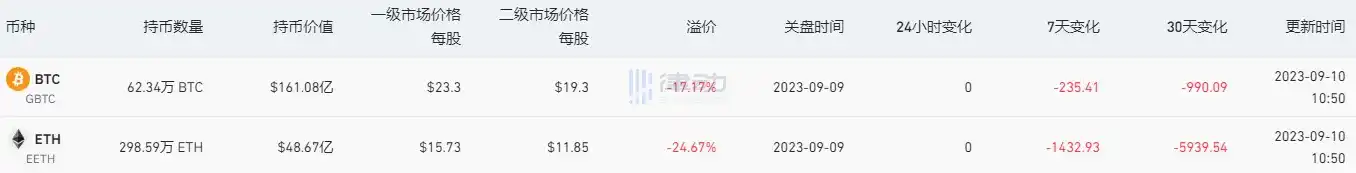 据 Coinglass 数据显示,当前灰度比特币信托基金(GBTC)的负溢价率为 17.17%;以太坊信托基金(EETH)负溢价率为 24.67%;