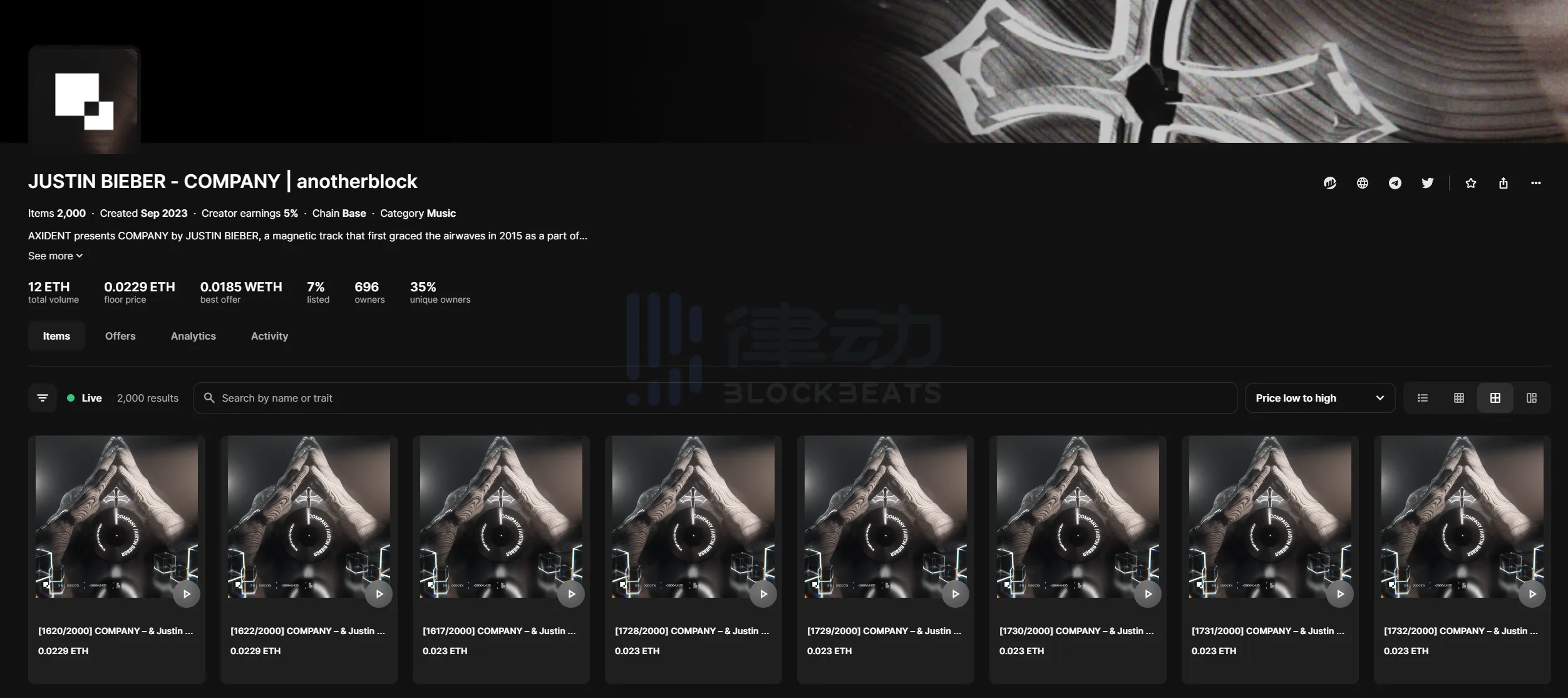 「Company」NFT 是区块链音乐平台 anotherblock 和「Company」的联合制作人 Andreas Schuller 之间的合作。该项目于 9 月 7 日发行,仅向粉丝和投资者以 0.017 ETH 的价格发售 2 千份,在 2 小时内全部售罄。