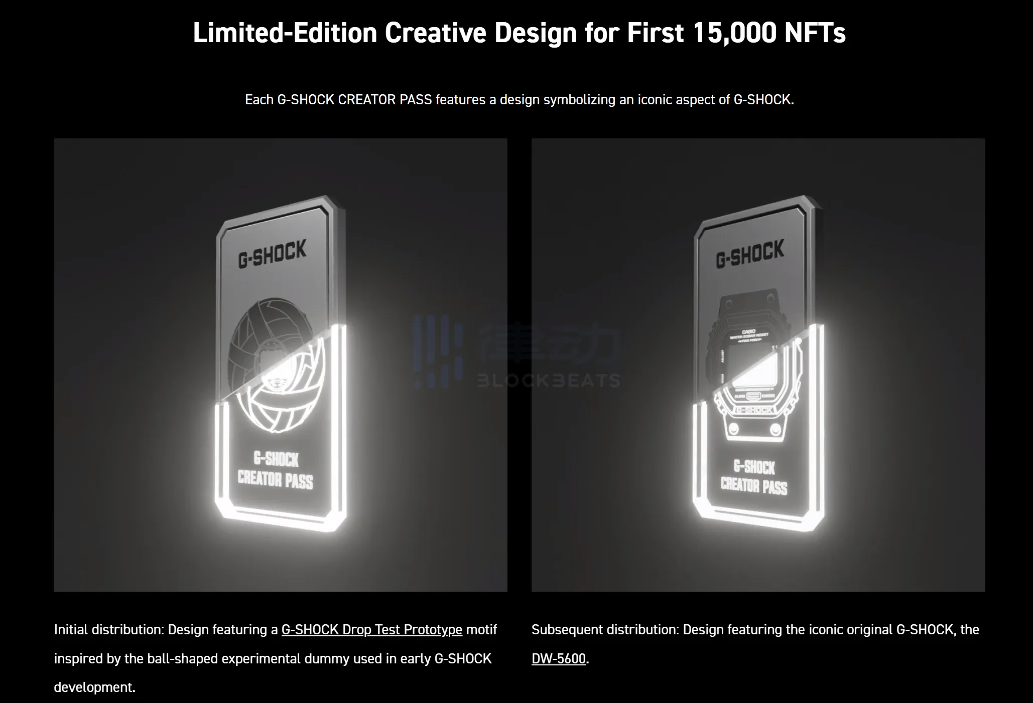 G-SHOCK CREATOR PASS。卡西欧官方发行,发行在 Polygon 上(又又又是 Polygon),总量 15,000 张,Free Mint。G-SHOCK CREATOR PASS 能使持有者加入 G-SHOCK 未来的新项目「VIRTUAL G-SHOCK (VG)」的社区,还将获得如活动提前通知、参与活动策划的福利。虽然 G-SHOCK CREATOR PASS 不可转让,未来的新项目「VIRTUAL G-SHOCK (VG)」目前可获取的信息也非常少,但是 Free Mint 还免 Gas,不撸白不撸,卡西欧 G-SHOCK 迷就更不要错过了。