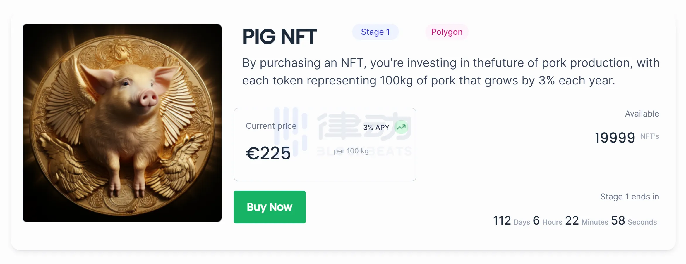GoAgro 上线的第一个项目是「PIG NFT」,花 250 欧元买一个「PIG NFT」,就相当于买了 100 公斤猪肉。将一个「PIG NFT」变成一头真实的猪需要 900 天,在此期间,「PIG NFT」的「质量」每年「增长」3%。在 900 提天后,根据实际养殖情况,可爱的猪猪可能会也可能不会能够兑换成实际的 107.5 公斤猪肉。当然,时间到了以后也可以选择不换成猪肉,比如您是一个 NFT 炒家,您可以拿去二级市场用 NFT 炒猪肉,又或者您是一个生存达人,手握 100+ 公斤猪肉等到世界末日再来兑换...