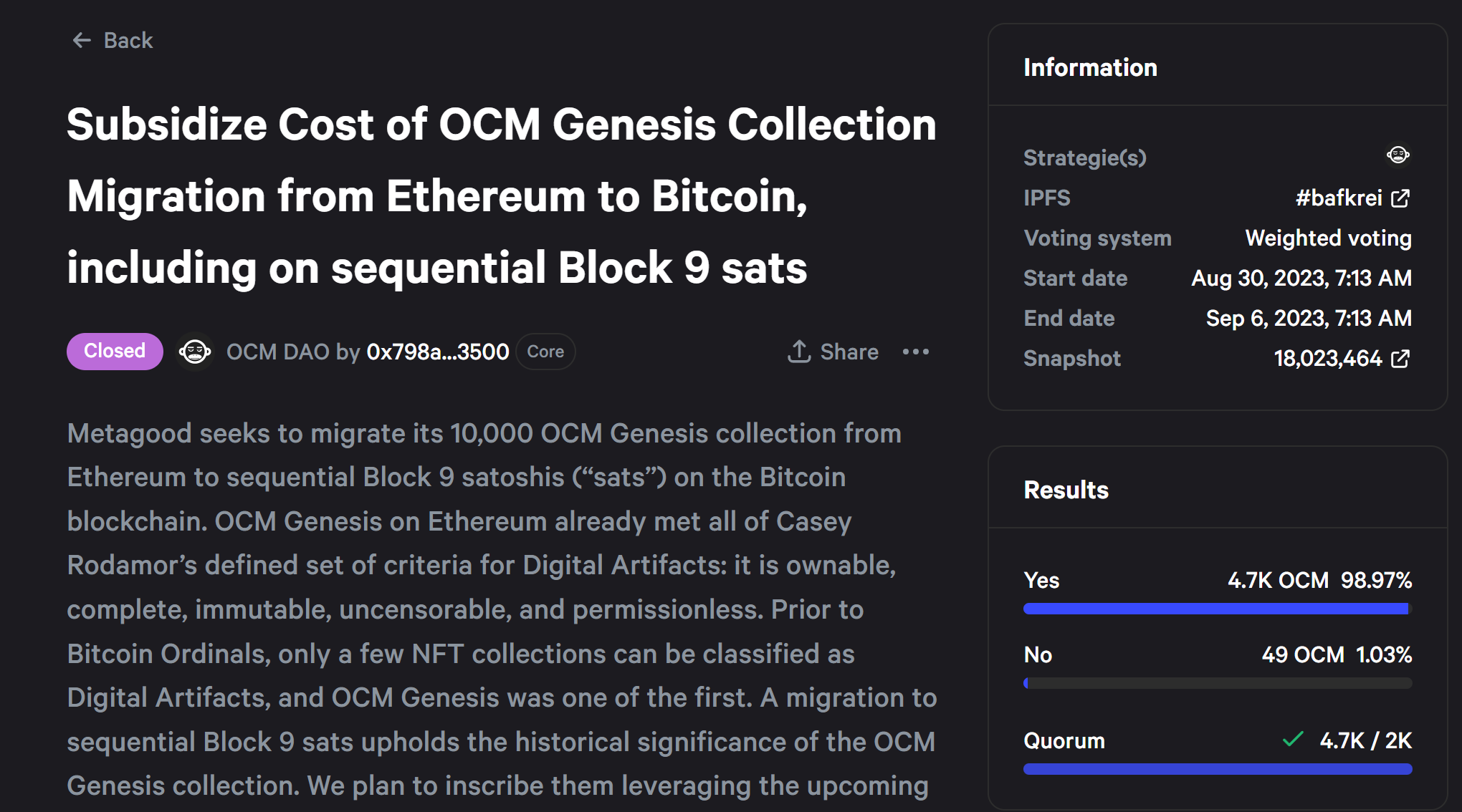以太坊 NFT 项目 OnChainMonkey 于 9 月 6 日正式通过了将系列迁移到比特币 Ordinals 生态的提案。