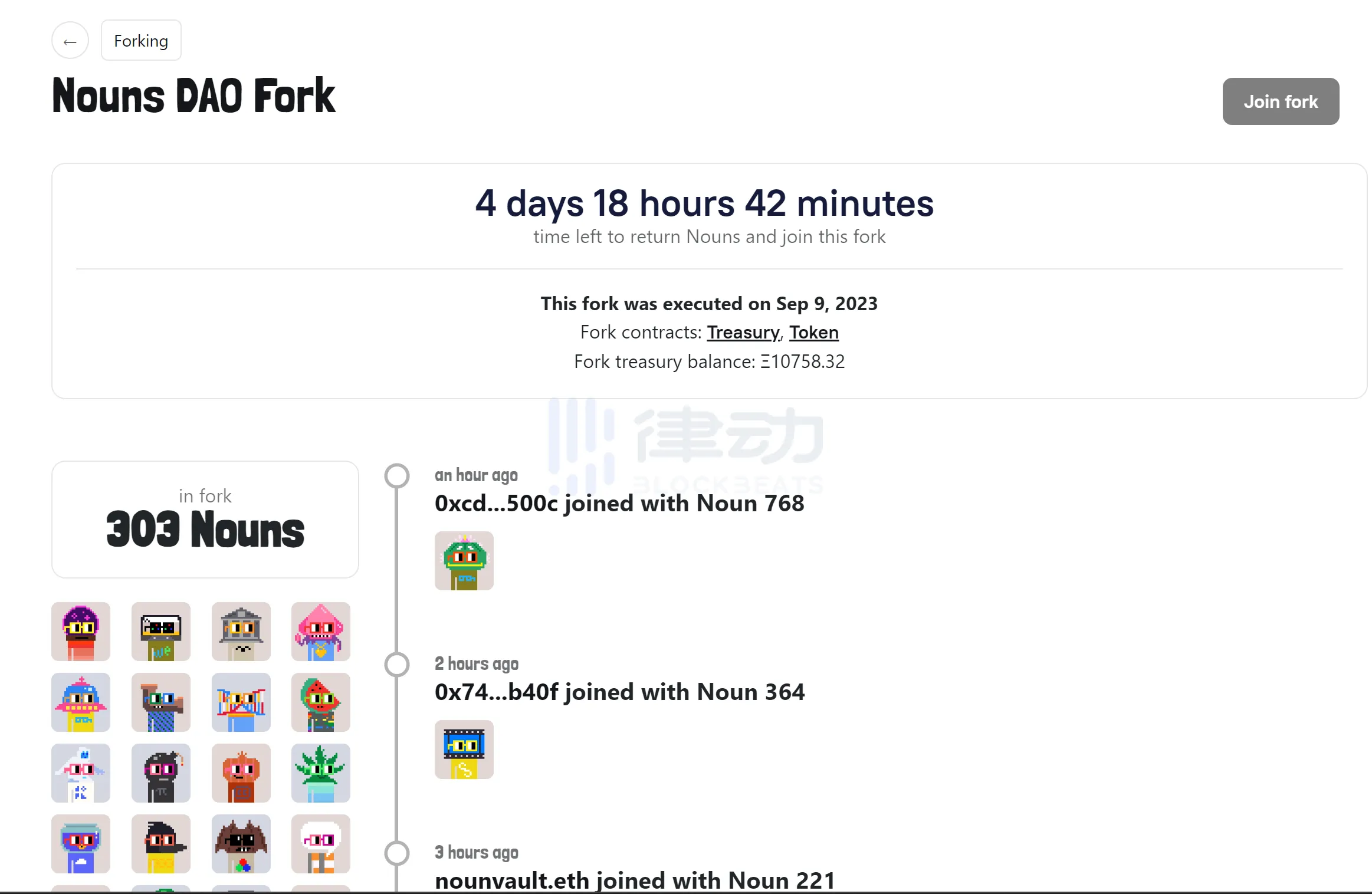 到 9 月 9 日,已经有超过供应量 20% 的 Nouns 支持分叉,Nouns DAO 随之进入「分叉期」。到 9 月 16 日,所有 Nouns NFT 持有者都可以选择离开原 Nouns DAO 转而加入分叉 DAO。分叉 DAO 的将从原 Nouns DAO 的国库中分割走相应份额的 ETH,目前,分叉 DAO 已有 303 个 Nouns NFT 加入,已从原 Nouns DAO 的国库分割走 10758.32 枚 ETH,每个分叉 DAO 成员都可以执行「愤怒退出」,归还其 Nouns NFT 以分得约 35.5 ETH,这和过往一周 Nouns NFT 竞拍的成交平均价格相近。