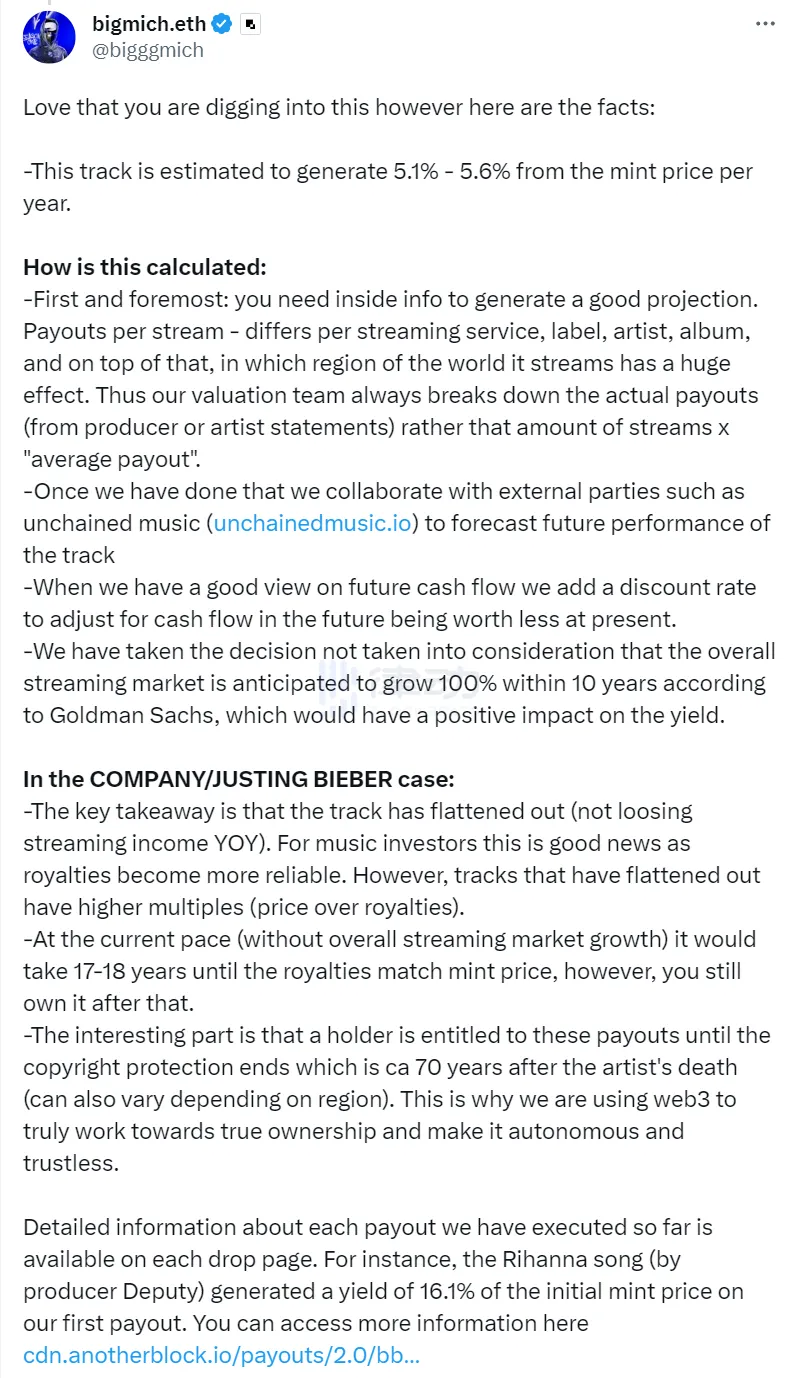 Andreas Schuller 将保留这首歌的权利,同时向拥有 NFT 的粉丝提供该歌曲流媒体收入 1% 的版税份额。也就是说,每持有 1 个「Company」NFT,每年能够获取该歌曲流媒体收入的 0.0005%。买这个 NFT 需要多久回本让 NFT 玩家们津津乐道,anotherblock 的 CEO @bigggmich 亲自下场算了一笔账: