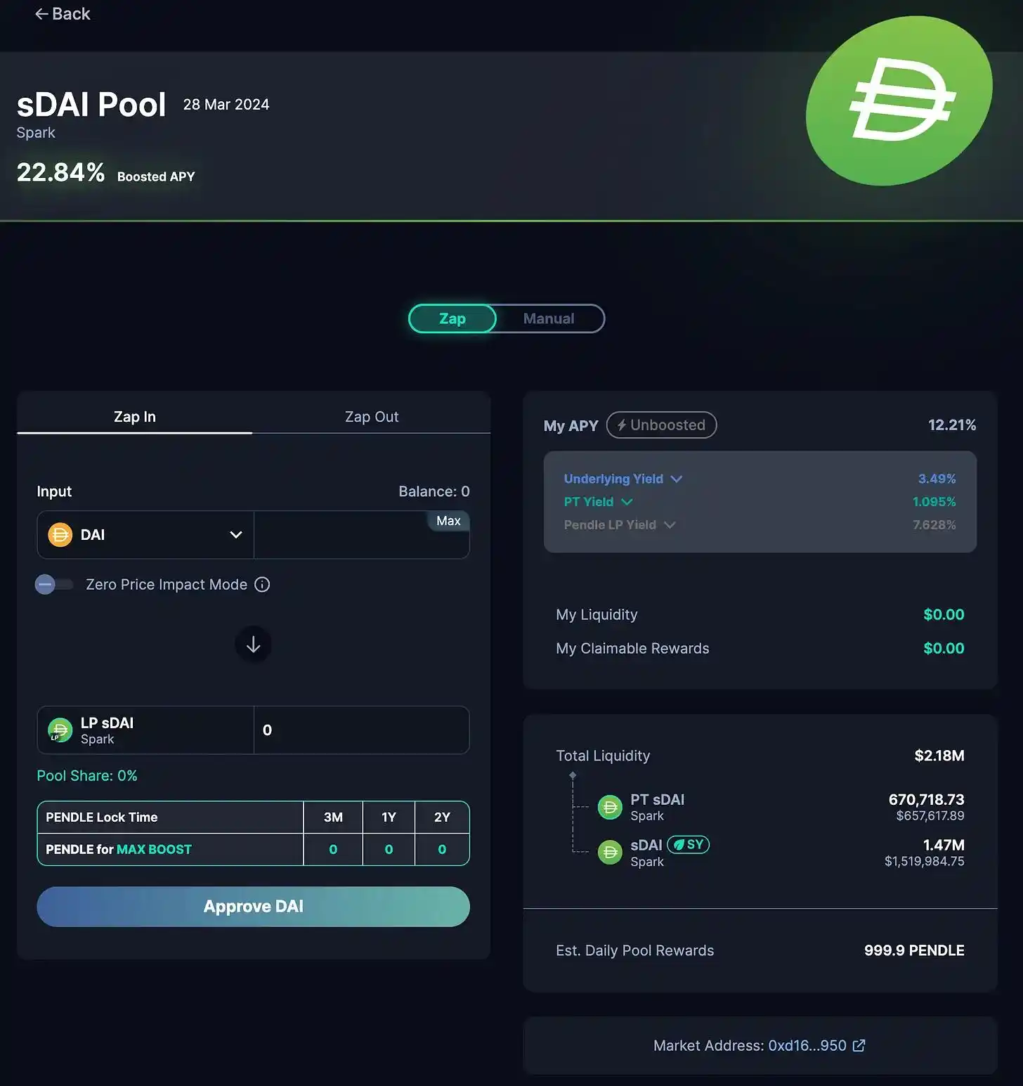 为了获得更高的收益,将 sDAI(DSR 中$DAI 的流动性代表)存入 Pendle Finance 的流动性池中。当前的收益率为未增强的 12% APY,如果将$PENDLE 作为 vePENDLE 锁定,则可达到最高 22.8% APY。收益来自底层的 5% 收益+交易费用+PENDLE 发行。