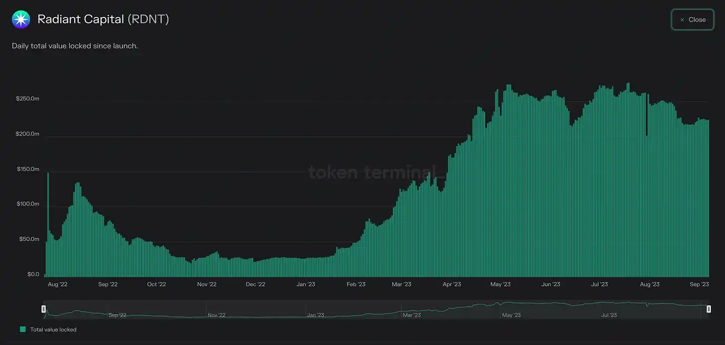 Radiant Capital 是 Arbitrum 和 BNB 链上的跨链借贷市场。他们在今年早些时候推出了 V2,引入了新的资产进入货币市场,以及一种新的 RDNT 发行结构,使其更具可持续性。这导致了 TVL 和普遍采用的激增,如下图所示。