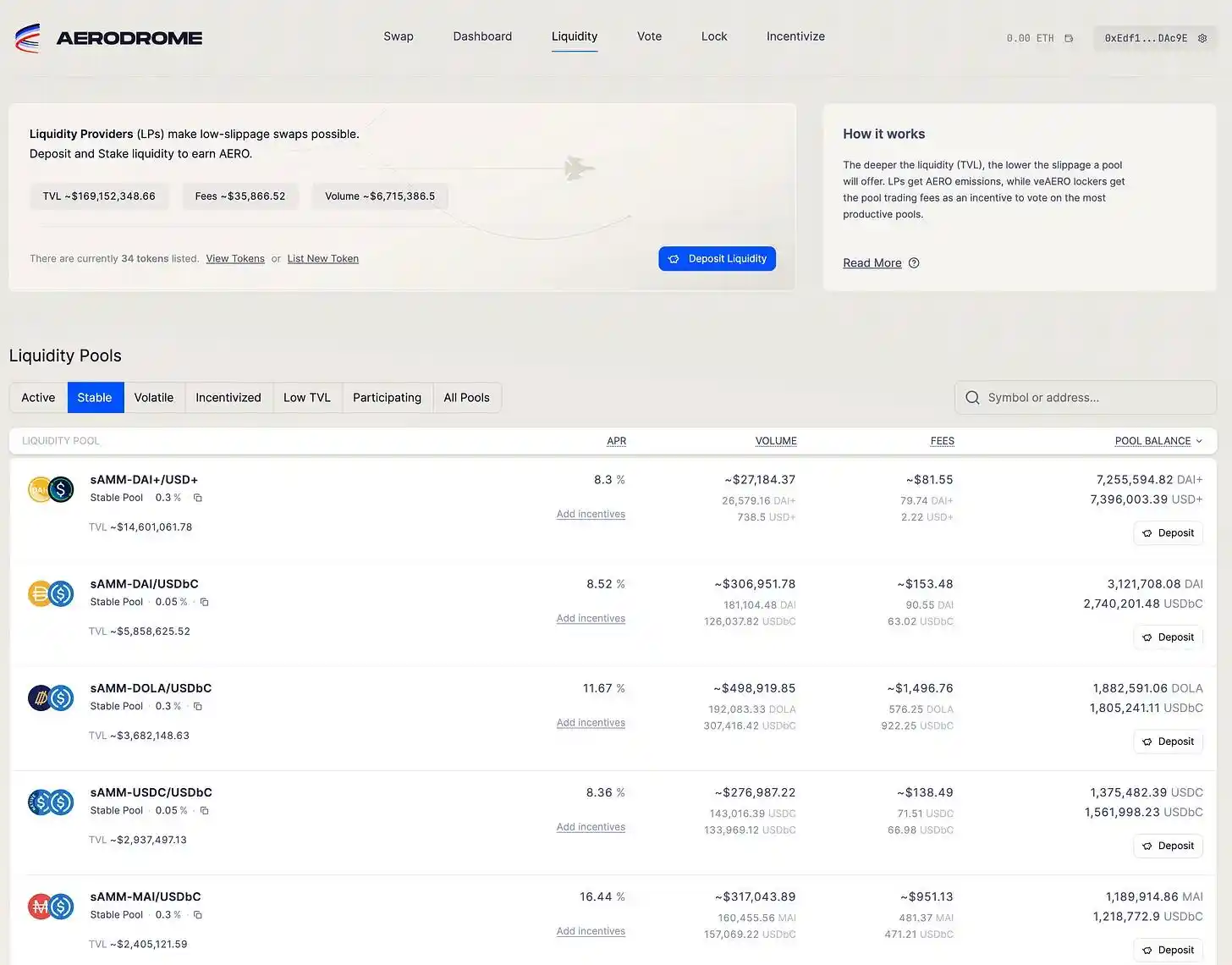 Aerodrome 是最近在 Base L2 上推出的 Velodrome 分叉项目,吸引了大约 1.7 亿美元的总锁定价值(TVL)。有几个稳定币池,通过支付$AERO 来提供激励,收益率为 8-16%,没有任何无常损失。