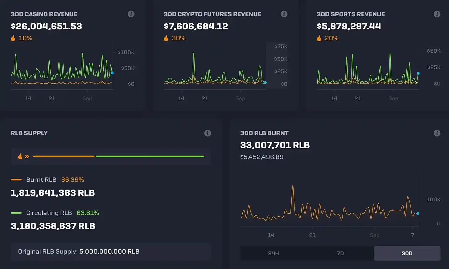 Rollbit 是另一个在 30 天收入方面令人印象深刻的协议,$RLB 的 P/R 倍数为 1.1。Rollbit 通过其赌场、体育博彩平台和加密货币期货交易产生收入。值得注意的是,其收入无法在链上验证,只能信任收入仪表板(如下所示)。这些产品的一部分收入被用于回购和销毁$RLB,从而对代币施加通缩压力。