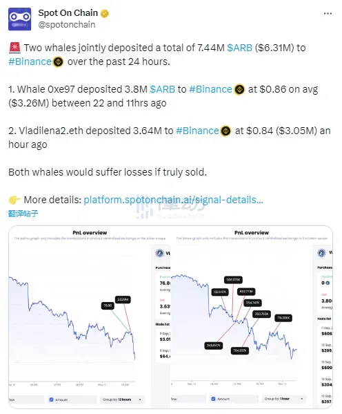 过去 24 小时两巨鲸累计向 Binance 转入 744 万枚 ARB,约合 631 万美元