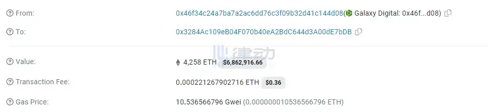 3. 标记为 Galaxy Digital 地址昨日向 Binance 转入 4258 枚 ETH,价值约合 685 万美元;