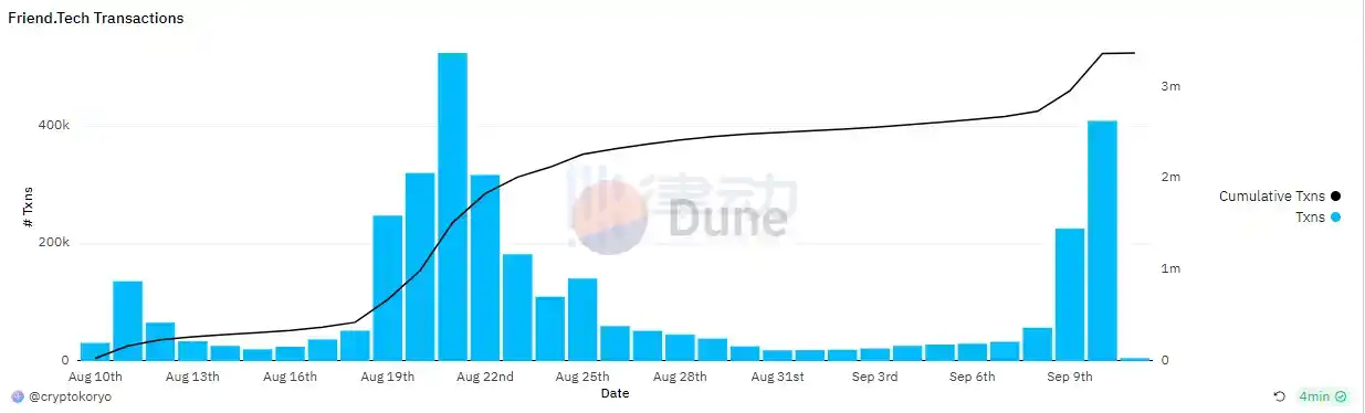 据 Dune 数据信息,friend.tech 自 9 月 9 日以来交易持续增长,其中昨日交易笔数达 40.9 万笔,单日涨幅达 81.7%。