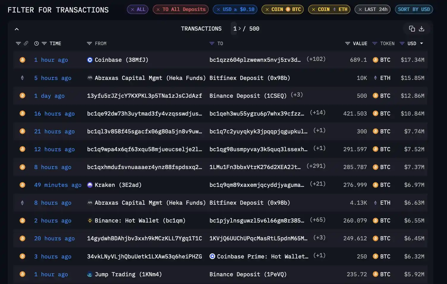 Abraxas Capital 昨日将 14,130 ETH 转入 Bitfinex,Jump Trading 将 236 枚 BTC 转入 Binance