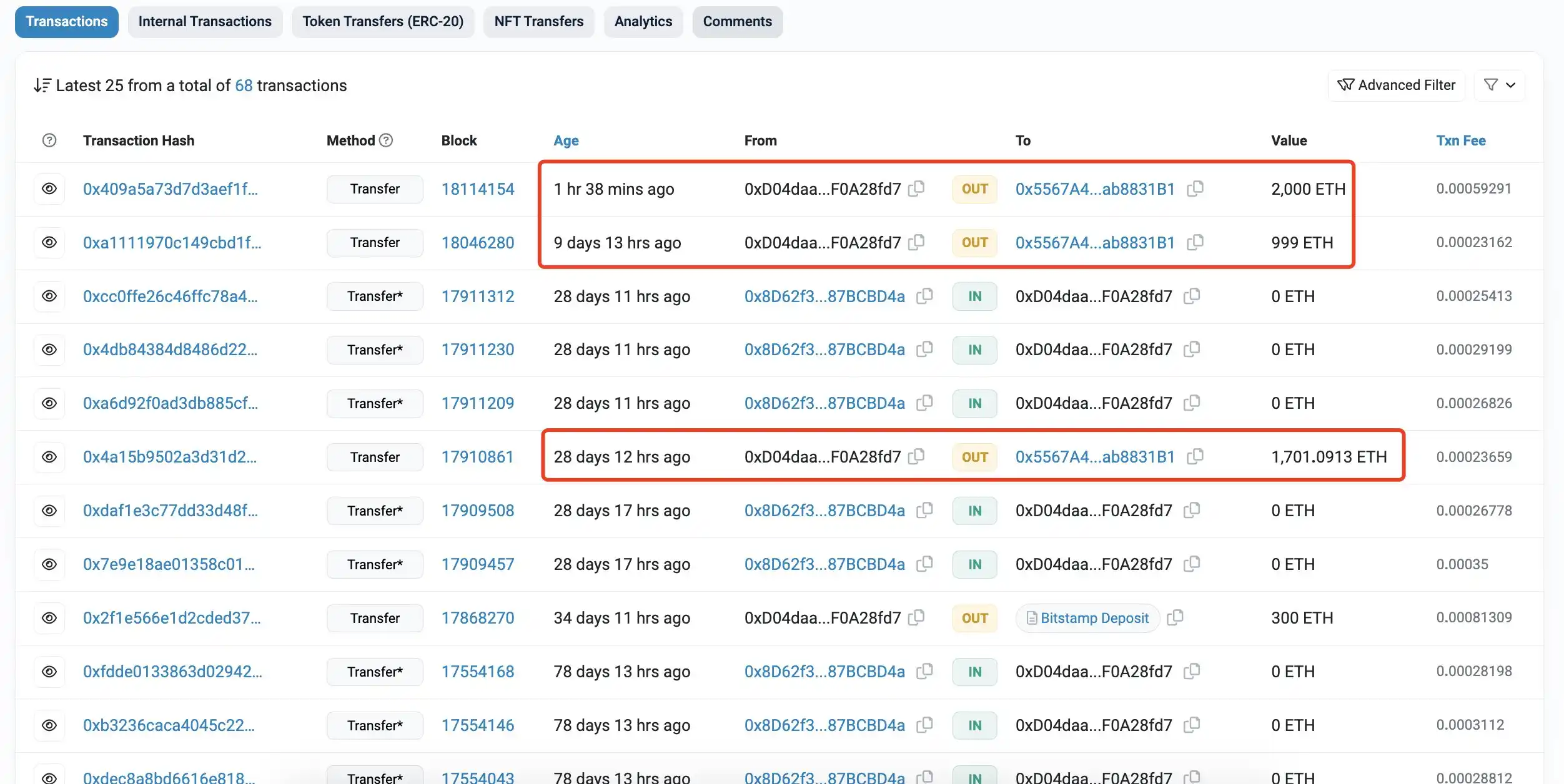 Vitalik 相关地址凌晨再次将 2000 ETH 转入 0x5567 开头地址,或仍将转入 Bitstamp