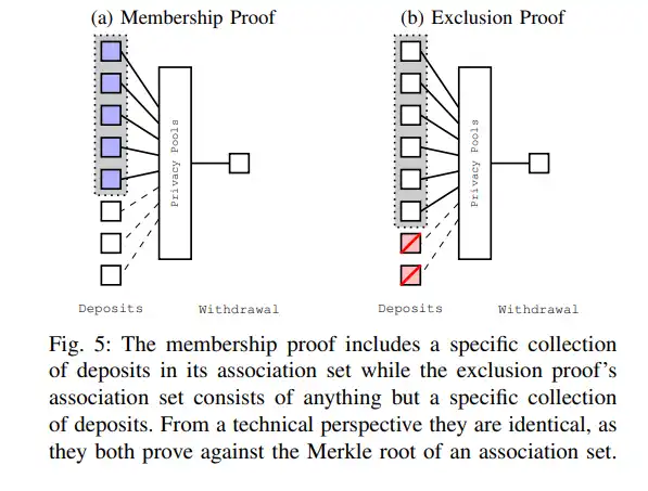 所谓关联集是由关联集提供者(ASP)遵循某些规则生成的,比如这个关联集的规则是「包含」——「来自受信任交易平台的所有存款」,另一些关联集的规则是「排除」——「除标记为有风险的存款外的所有存款」。然后用户只需要证明自己的关联集成员资格,无需公开透露选择的是哪一个关联集,只需要做出承诺,就可以在不完全披露其交易的情况下表明合规性。