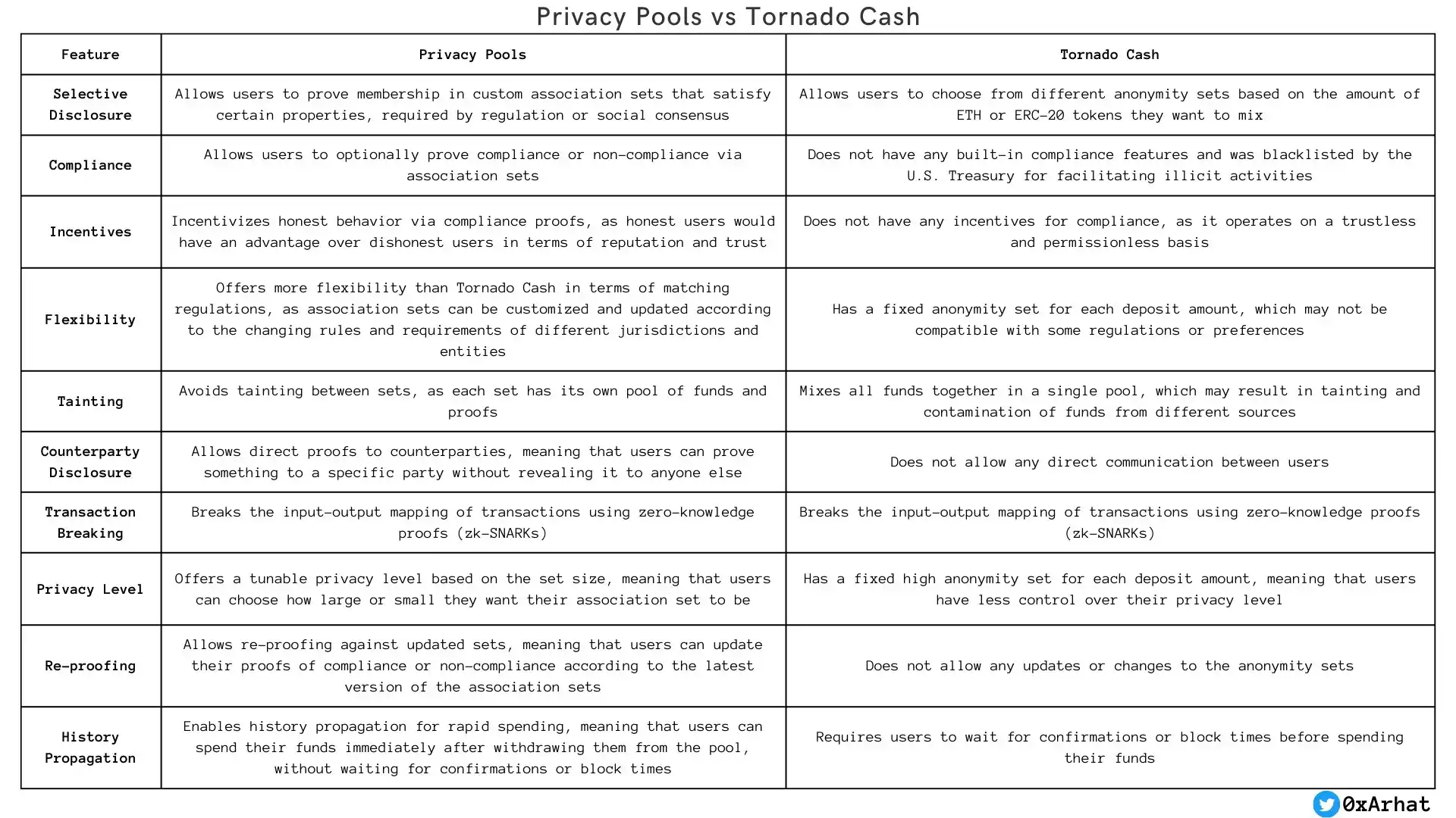 推特用户@0xArhat制作了一张表格将两者从灵活性、披露情况、隐私级别等多角度进行了对比。