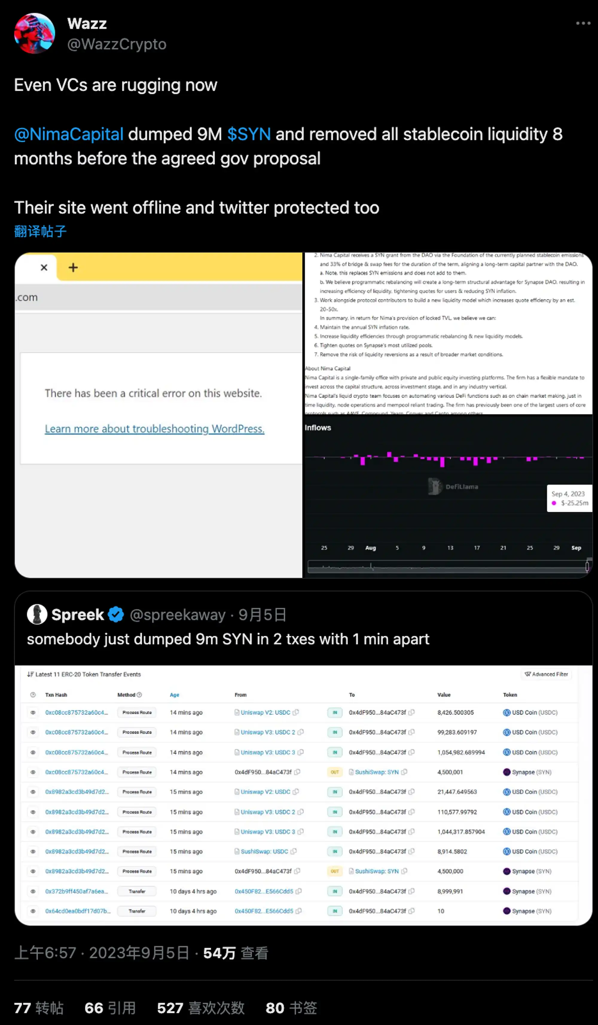 甚至已经发生了更差的情况。由单一家族办公室支持的 Nima Capital 在 9 月 5 日违反治理提案的将 900 万枚 SYN 卖出,并提走了所有的稳定币。甚至连其官网都已经无法访问,推特账户也处于保护状态。而在 8 月份,与 Nima Capital 相关联的一个纽约的公寓以 8000 万美元出售。