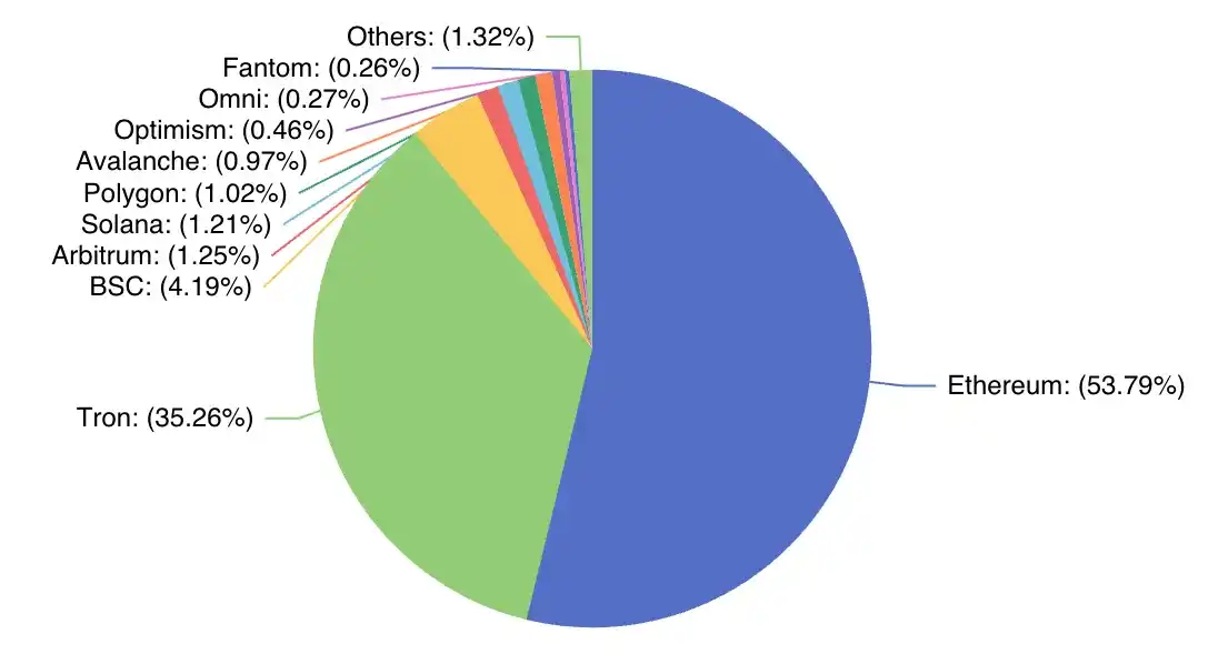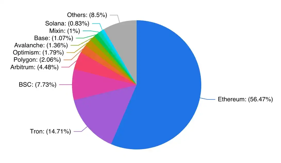 此外,以太坊在稳定币市场上占据主导地位,结算的稳定币总额超过 690 亿美元,占稳定币市值总额 1300 亿美元的一半以上。唯一接近的链是波场,其结算的稳定币总额为 440 亿美元,其中 92% 是泰达币(USDT)。