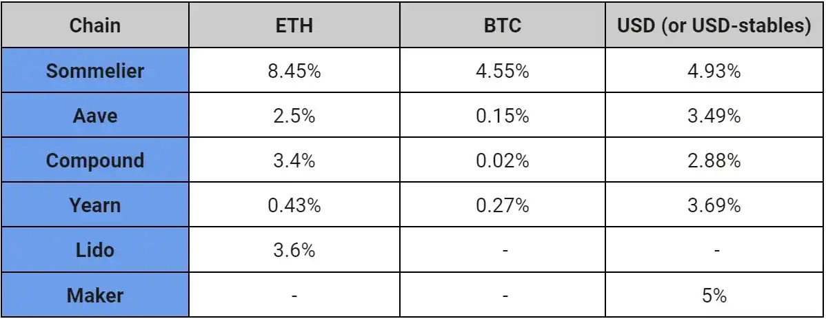 除了 Maker 之外,Sommelier 对 ETH、BTC 和稳定币的收益完胜任何蓝筹协议。即使是 Maker 对 DAI 的 5% 收益也只是为了吸引 TVL 而采取的临时措施,将在未来几周内降至 3.19%。