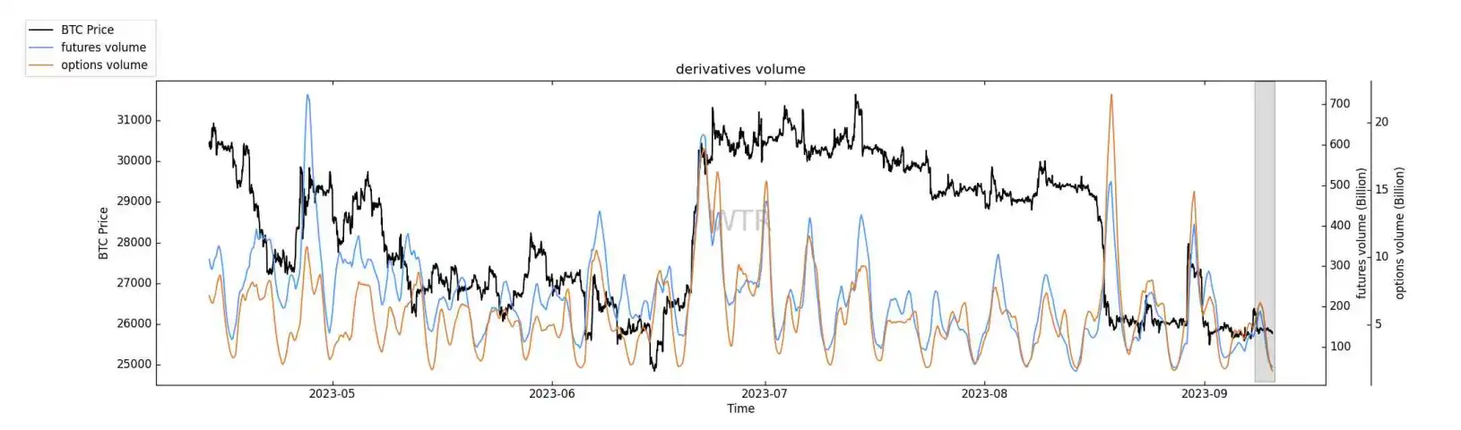 衍⽣品成交量⽆太多波动仍处于低位⽔平,衍⽣品交易者持观望状态较多。
