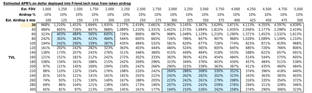 ● 如以下表格,若最终 Friend.Tech 发币 FDV 为 1.5 Bn,10% 作为空投,平均 25 周内 TVL 为 80 mm,而参与者空投比例与参与 TVL 相当,则最终年化空投利率约为~360%。