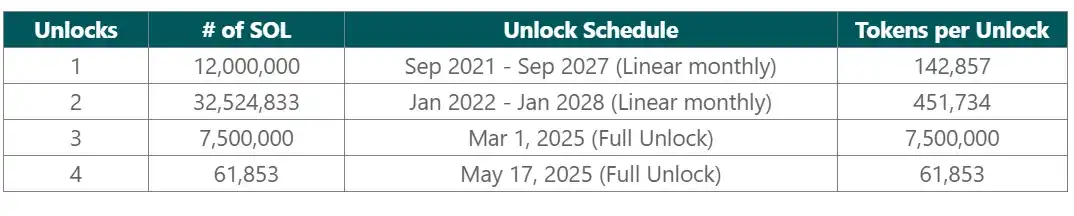 根据解锁计划,每个月解锁 618.4 万个 SOL。这个月度释放大约占 FTX 总 SOL 持仓的 1.1% 。然而,值得注意的是,预计在 2025 年 3 月 1 日将解锁 750 万个 SOL,占 FTX 总 SOL 持仓的 13.5% 。