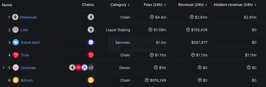 过去 24 小时 friend.tech 协议费用达 120 万美元排名第三,仅次于以太坊和 Lido