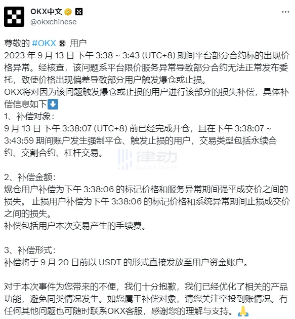 9 月 13 日,据 OKX 行情信息,其平台上含 TRB、PERP、WLD、YGG 等多个币种在内的永续合约交易对出现插针行情,其中,TRB 短时波动超 90%,PERP 价格上下波动 22%。随后,欧易 OKX 中文官推表示,9 月 13 日 下午 3:38 ~ 3:43 (UTC+8) 期间平台部分合约标的出现价格异常。经核查,该问题系平台限价服务异常导致部分合约无法正常发布委托,致使价格出现偏差导致部分用户触发爆仓或止损。OKX 将对因为该问题触发爆仓或止损的用户进行该部分的损失补偿,具体补偿信息如下: