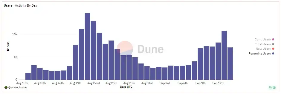 如果我们看一下日活跃用户,可以看到在过去两周稳步增长。还应考虑到此活跃度仅跟踪进行交易的用户,不包括持有 Key 和参与群聊的用户,因此实际数字可能要高得多。