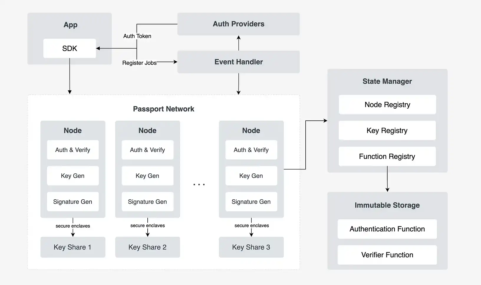 为此,0xPass 采用了多方计算(MPC),将密钥「分片」成多个部分,并将其分发给多方。传统的 MPC 解决方案在用户和服务提供商后端之间分配密钥份额,而 0xPass 允许密钥份额跨网络节点分配。通过将私钥划分为多个共享并将其分散在节点上,Passport 实现了额外的安全层,确保任何单个节点都无法危害整个系统。