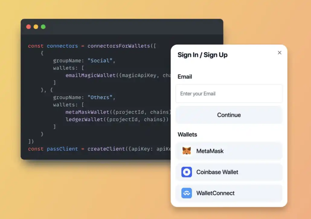 开发人员可以使用 0xPass 为已经拥有钱包和尚未拥有钱包的用户提供登录选项,比如使用 0xPass 钱包连接器来连接传统的 EOA——例如 Metamask、Coinbase Wallet、Rainbow Wallet。然而,账户抽象标准仍处于萌芽阶段,随着不断更新的标准,帐户抽象的实施对于开发人员来说是一项耗时的工作。但通过 0xPass 钱包适配器,Web2 和 Web3 应用程序都可以将钱包嵌入到应用程序中,而无需重新发明基础设施并将复杂的钱包集成难题的各个部分组合在一起。