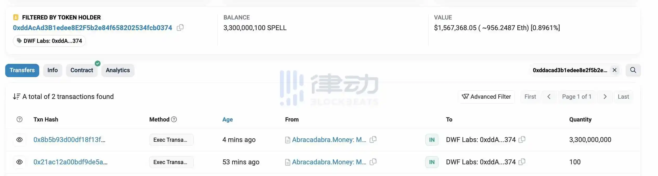 DWF Labs 从 Abracadabra.Money 收到 33 亿枚 SPELL,约合 157 万美元