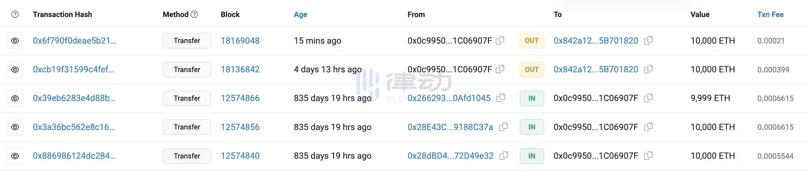 数据:一休眠两年的巨鲸地址再度转出 10,000 枚 ETH