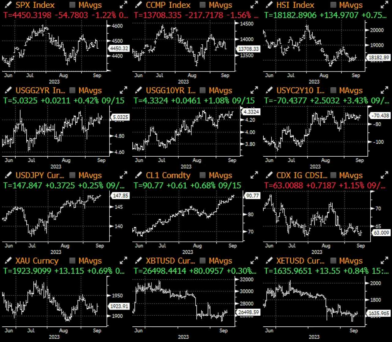 美债市场整周都未能得到缓解,2 年期收益率周五收盘时高于 5.03%,而 10 年期收益率则回到近期高点 4.33%;市场定价认为本周三会议暂停加息的机率为 99%,而预期 11 月加息的机率又回到了近期低点,仅有 30%。