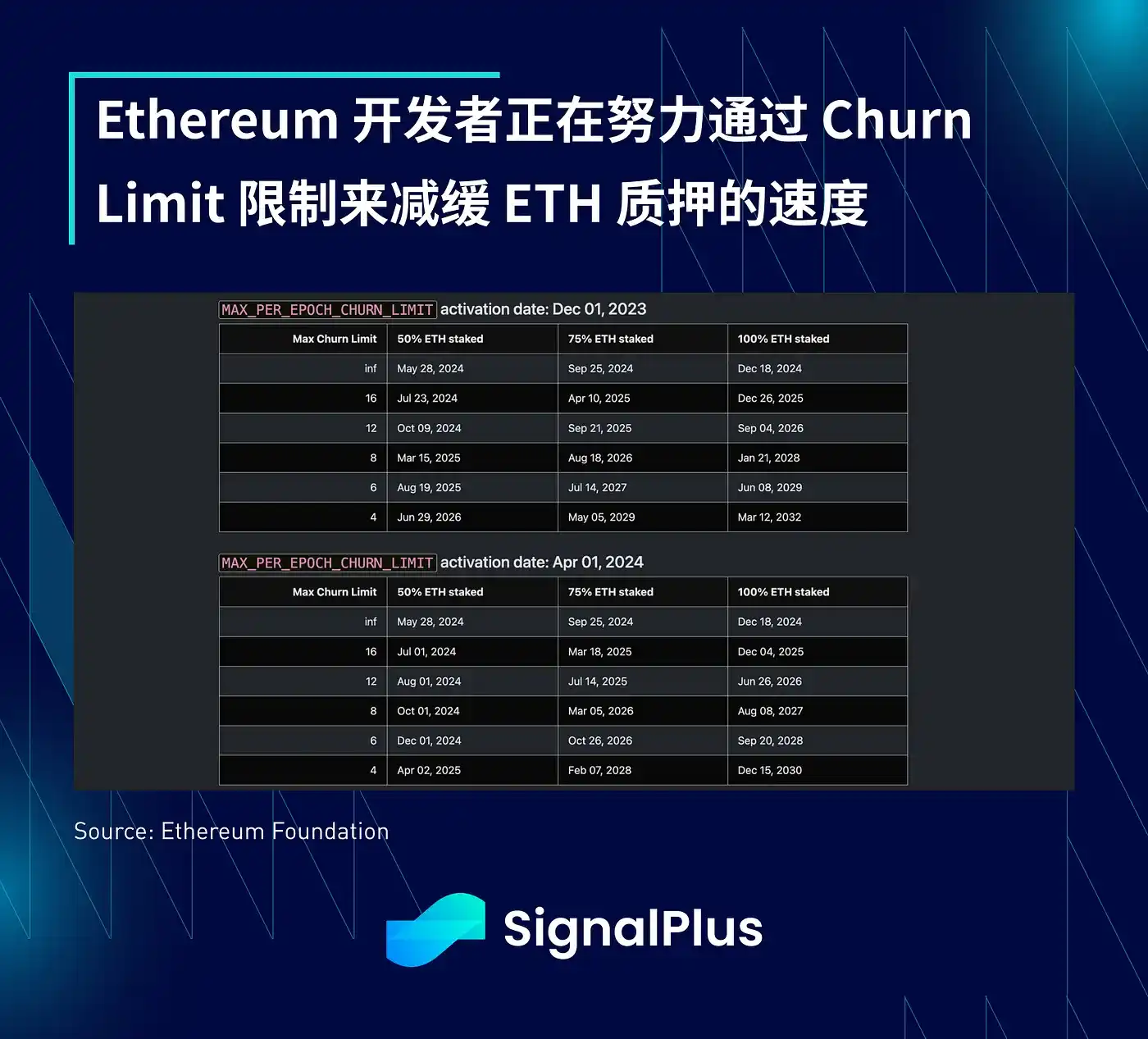 另一方面,目前约有 20%(410 亿美元)的 Ether 流通量已被质押锁定,用于产生长期收益,根据一些 Ethereum 开发者的估计,按照目前的速度,到明年 5 月将有近 50% 的 Ether 流通量会被锁定,而到明年 12 月这个比例可能会达到 100%,为因应这个情况,他们推出了新的 EIP-7514 提案作为下次主要升级的一部分,通过设置新验证者数量(「churn change」)来减缓质押的速度,这可以将达到 100% 质押的时间推迟几年至 2030 年,作为一个暂时的解决方案,为社区争取时间直到找到更长期的解决方案。