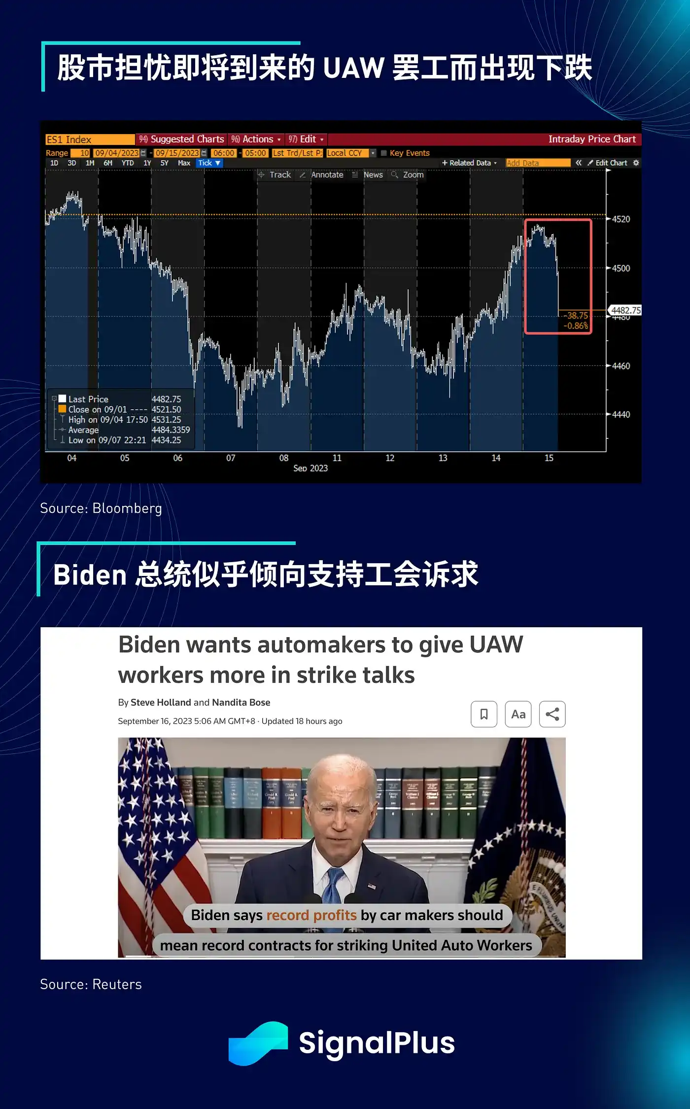 然而,周五股市出现反转,自纽约开盘后几乎直线下跌了 1.2%,市场对美国汽车工人联合会 (UAW) 的大规模罢工行动表示担忧,这是该工会 88 年的历史上首次同时针对三大汽车制造商进行罢工,车辆短缺可能会在中期加剧通胀压力;UAW 的诉求较为激进,要求在 4 年内加薪 40%,并减少工时至每周 4 天、共 32 小时,同时也要求生活成本和养老金调整等相关福利,这些都会导致汽车制造商的劳动成本上升且盈利能力下降;此外,Biden 总统似乎倾向支持工会工人这一点也令市场感到担忧,但考虑到 UAW 是唯一一个还没有对即将到来的 2024 年总统选举给出支持的主要工会,这个举动也不令人意外。