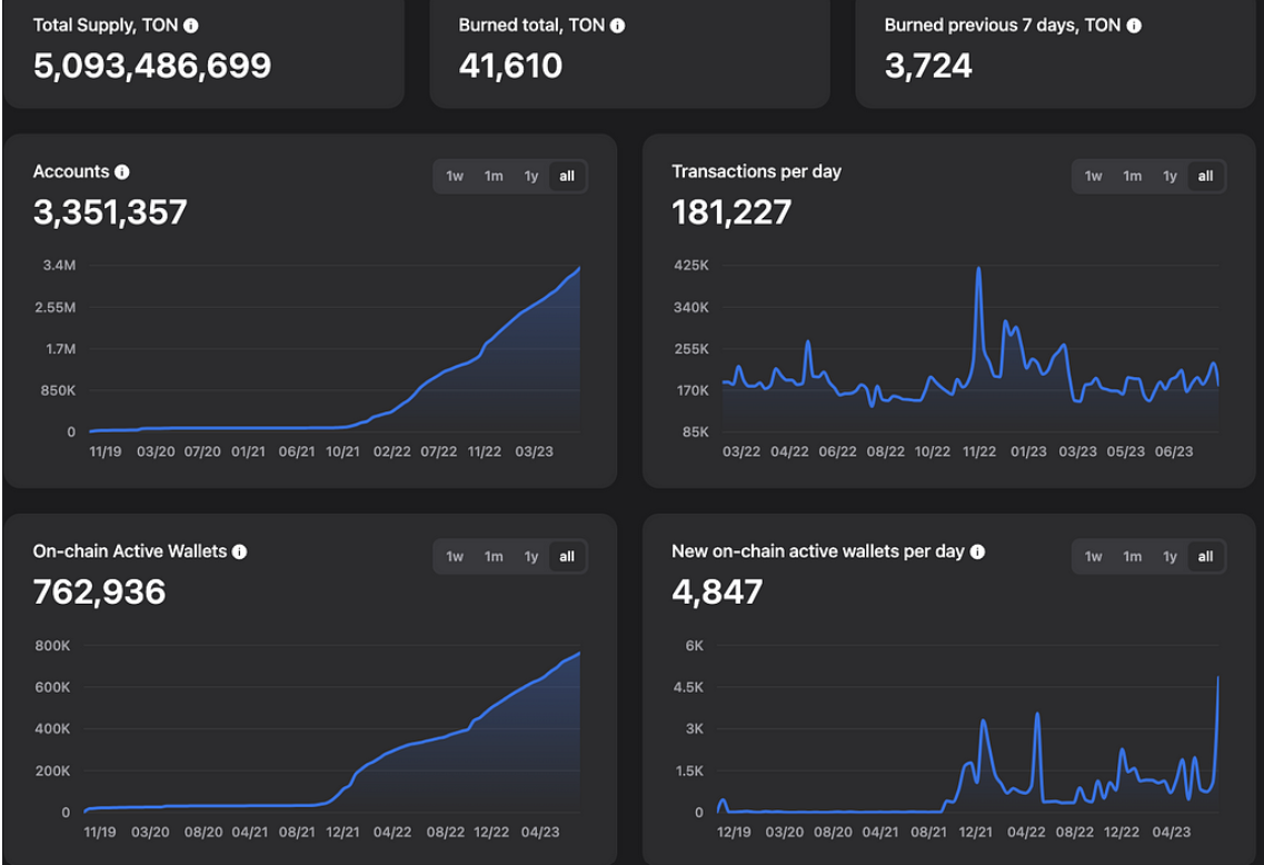 Ton 网络目前验证阶段数量为 343 个,TON 代币质押量为 4.86 亿枚,占代币总量的 9.5%,占流通代币量的 14.12%。被销毁代币量为 4.16 万枚。自 2022 年 1 月开始,网络账户数和活跃地址数保持稳定增长,当前账户总量为 335.1 万,活跃地址数约为 76.5 万笔,日均交易量 16 万笔,每日新增链上地址数约为 700–900 之间。