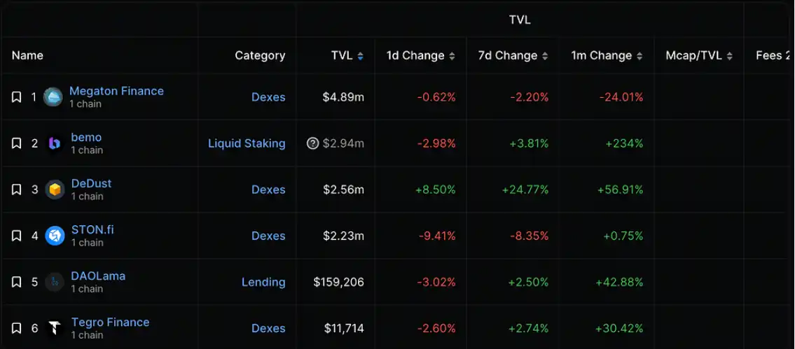 根据 Defillama,TON 当前 TVL 为 9.85M,历史高点也仅有 21.04M,TON 的生态处在非常早期发展阶段。