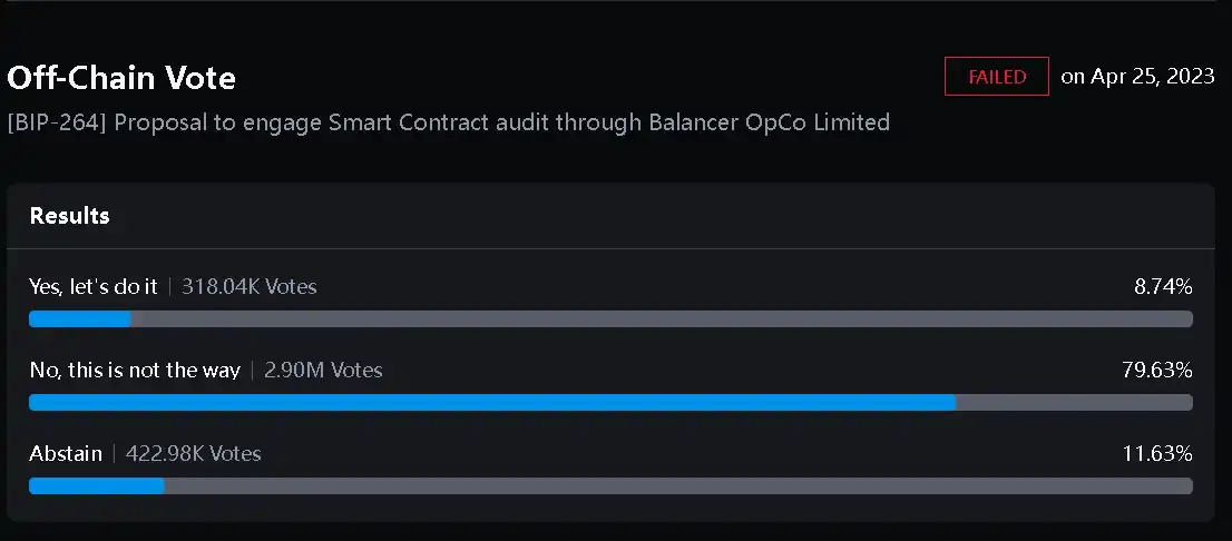 值得注意的是,今年 4 月,Balancer 治理在提案中更新了 Orb Collective 的财务计划,以续签 Certora 的智能合约审计合同,自 2023 年第二季度开始从 Orb Collective 的预算中分配给 OpCo,目的是保证 Balancer 用户的资金安全。但 Balancer DAO 社区成员以近 80% 的比例否定了 Balancer OpCo Limited 进行智能合约审计的提案,这也是在 7 条提案中唯一被否定的提案。